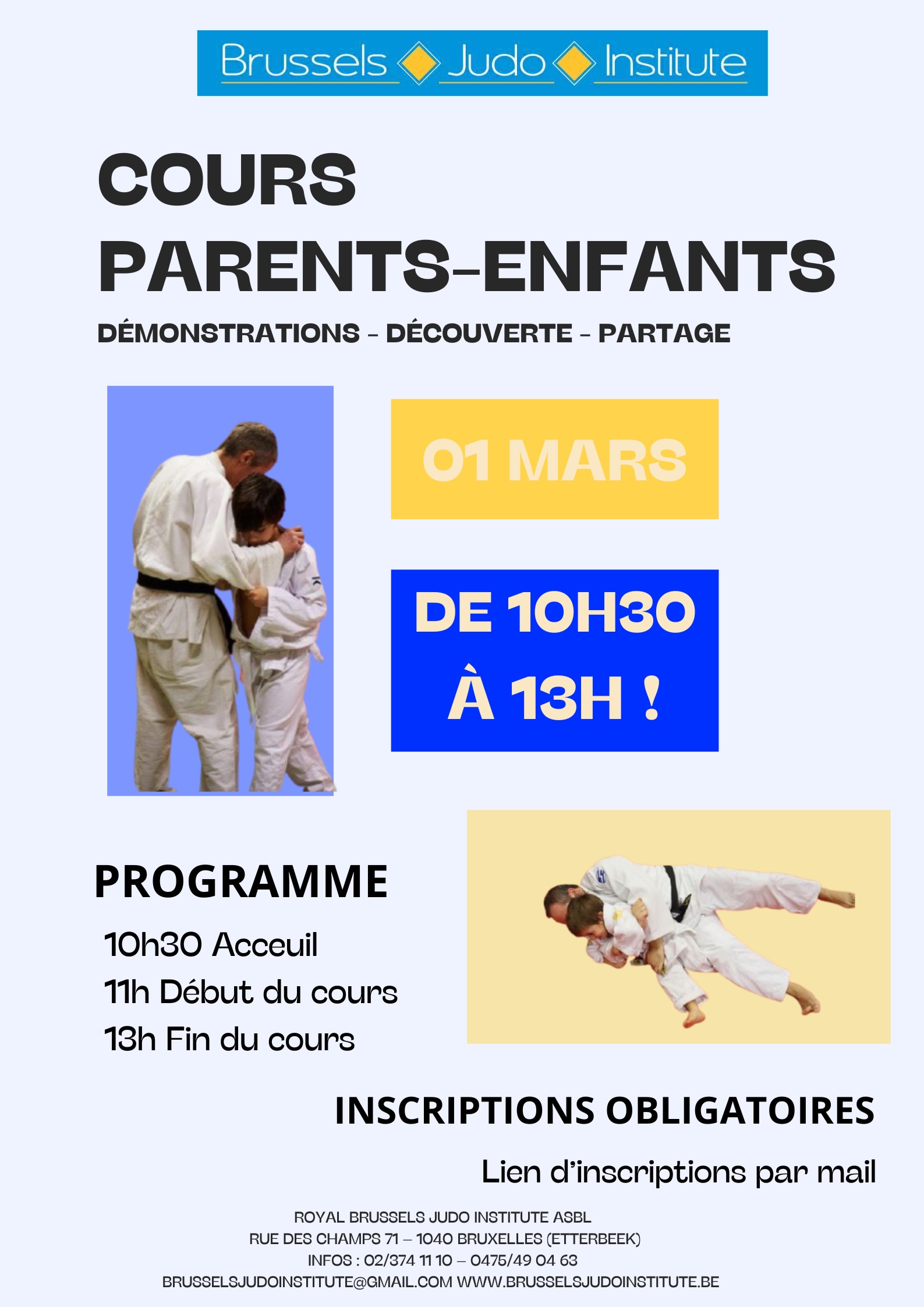 Durant ce cours, ils vous montreront ce qu’ils ont appris jusqu’à maintenant, vous feront voyager au cœur de leur monde et vous tiendront la main pour vous accompagner durant votre (peut‑être) premier cours de judo. Profitez de cette occasion pour passer un moment privilégié avec votre enfant !